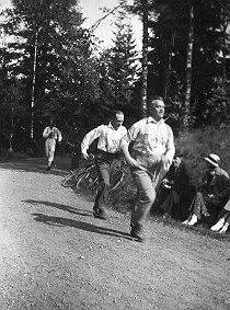 Gångtävling. Torsten Svensson går i mål före Nisse Johansson.