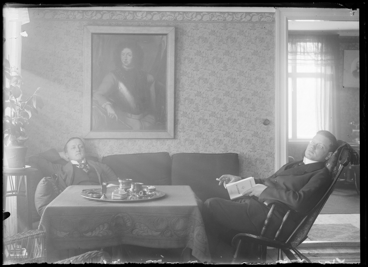 Axel Nylander vilandes i en gungstol. Håller en bok med titeln "Äfventyr".