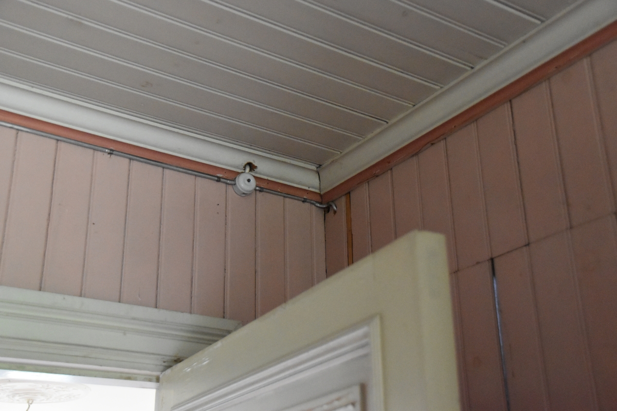 Titel: Interiör från korsplanshuset på Nygårdsgården i Bingsjö. Hallen på bottenvåningen med tillhörande trappor till källare och övervåning. Huset uppfördes 1912.