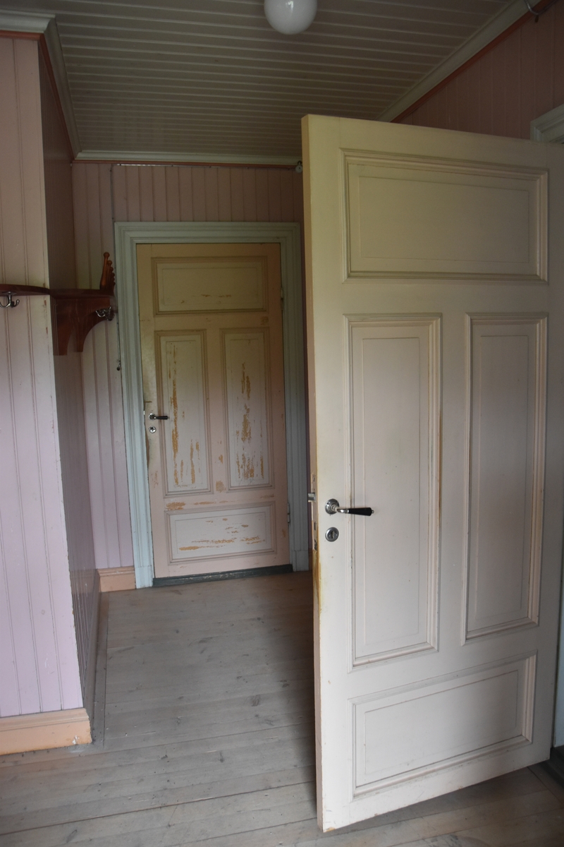 Titel: Interiör från korsplanshuset på Nygårdsgården i Bingsjö. Hallen på bottenvåningen med tillhörande trappor till källare och övervåning. Huset uppfördes 1912.