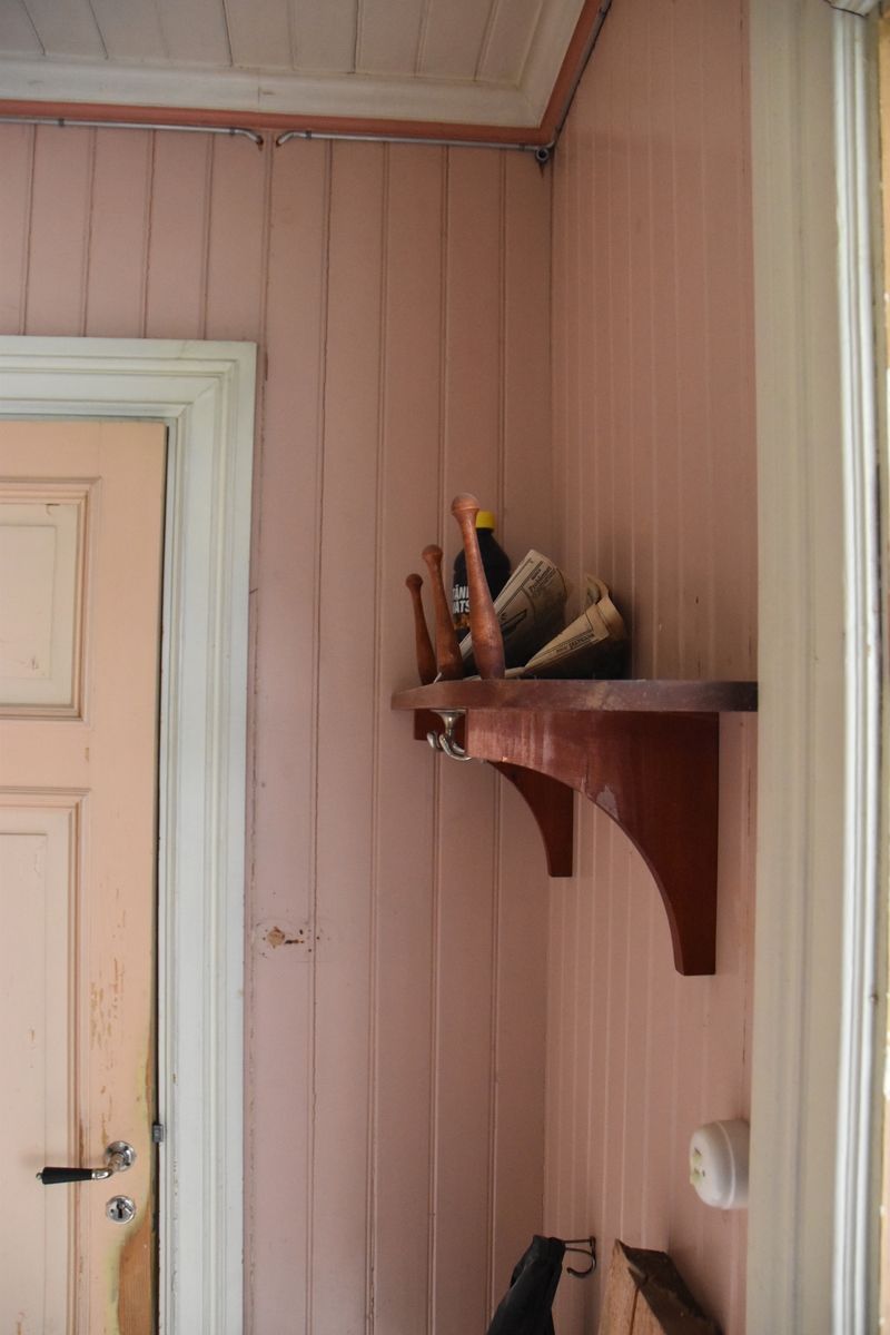 Titel: Interiör från korsplanshuset på Nygårdsgården i Bingsjö. Hallen på bottenvåningen med tillhörande trappor till källare och övervåning. Huset uppfördes 1912.