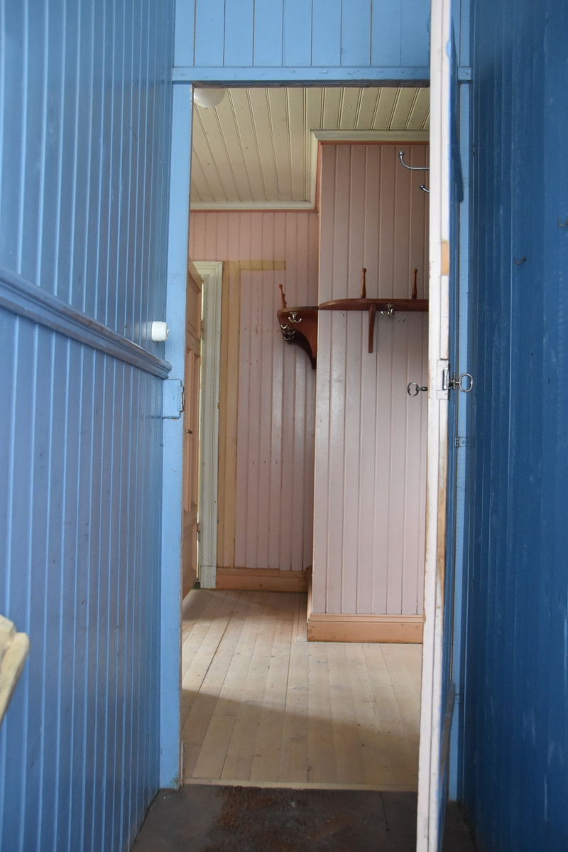 Interiör från korsplanshuset på Nygårdsgården i Bingsjö. Hallen på bottenvåningen med tillhörande trappor till källare och övervåning. Huset uppfördes 1912.