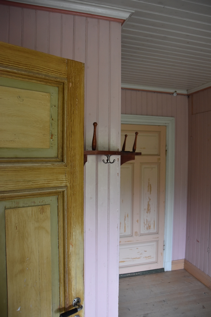 Interiör från korsplanshuset på Nygårdsgården i Bingsjö. Hallen på bottenvåningen med tillhörande trappor till källare och övervåning. Huset uppfördes 1912.