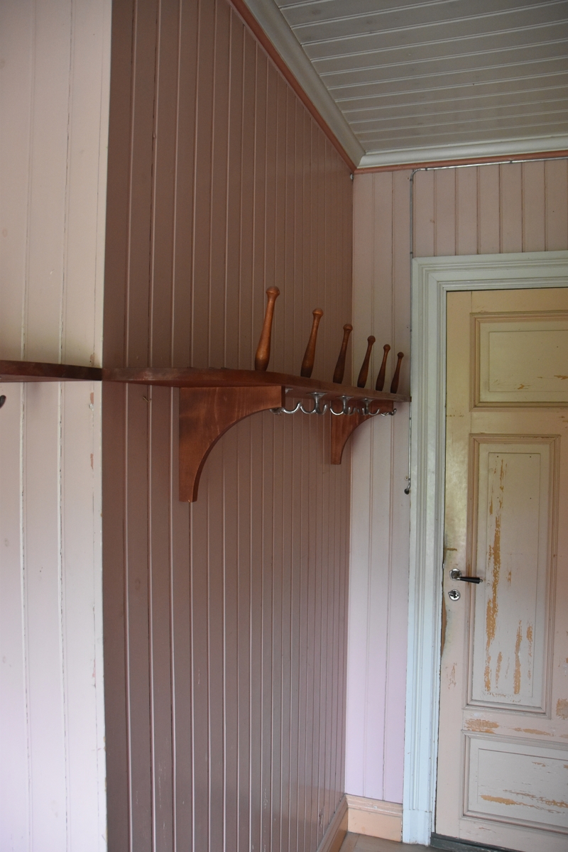 Titel: Interiör från korsplanshuset på Nygårdsgården i Bingsjö. Hallen på bottenvåningen med tillhörande trappor till källare och övervåning. Huset uppfördes 1912.
