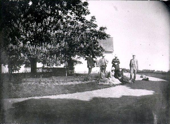 Åkatorp. Midsommarafton 1891. Stående fr. vänster: Johan Stenbeck, Sigge Stenbeck, Gustafa Stenbeck, Gunnar Stenbeck. Sittande: 2 obekanta (damen i mitten kan vara Mea Lindeberg, född Grenander, var guvernant till Ingeborg. Damen till vänster torde vara Amelia Tham född Blom). Ingeborg Stenbeck.