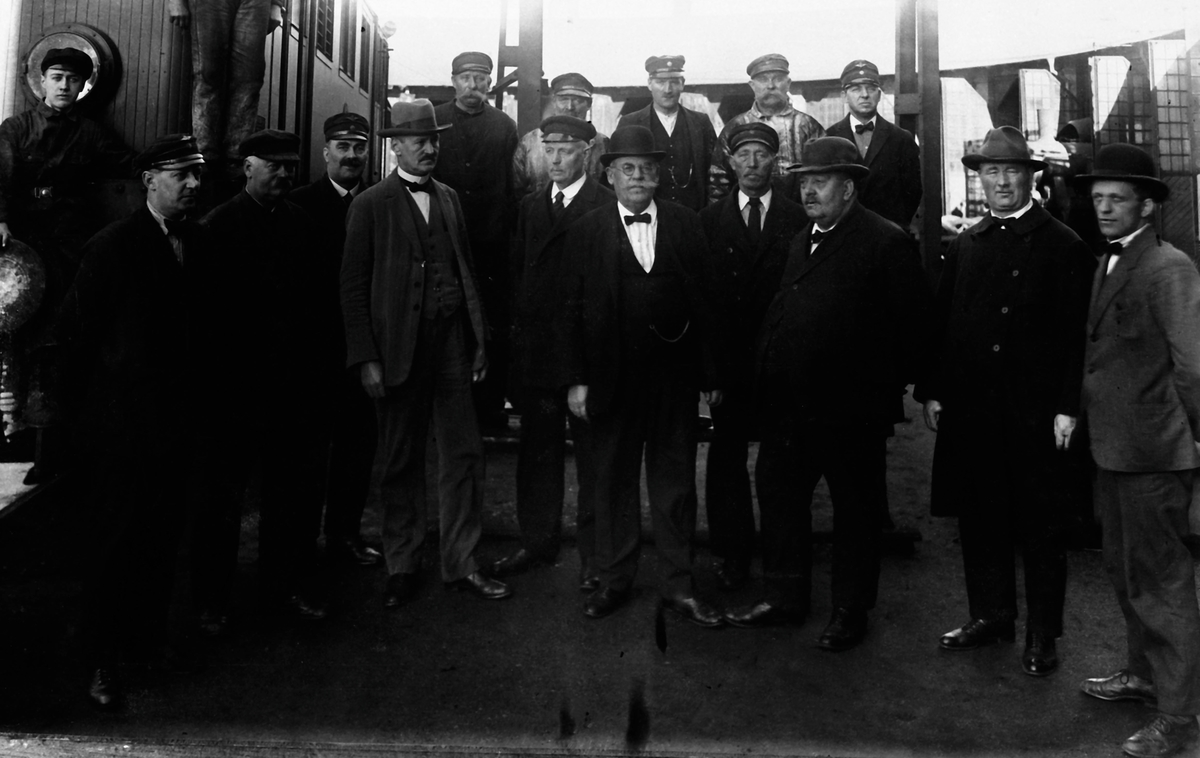 Järnvägsmän vid ett lok på bangården. 1. Gösta Hallberg ( på bufferten) son till Ernst Hallberg, Gudhemsvägen. ing. 2. Per Vallberg, lokförare 3. Reimers, lokreparatör 4. Gustavsson, stallkarl Torstenssonsgatan. 5. Axel T.Lindgren, kontorist Döbelnsgatan 7, stadsfullmäktige m.m. 6. rep. Zetterberg, 7. Erik Larsson, kontorist 8. skymd, 9. lokmästare Danielsson, son till Daniel Svensson Odensberg, 10. bakom den föregående, 11. förman Persson? 12. (bakom den föregående) Blomén, rep. Ällagatan 13. Johan Olsson (ordf. i västra kommunen) 14. lokeldare Bengtsson (Tommis), 15. okänd 16. Folke Hallberg, 17. på loket Karl Ljungqvist.
