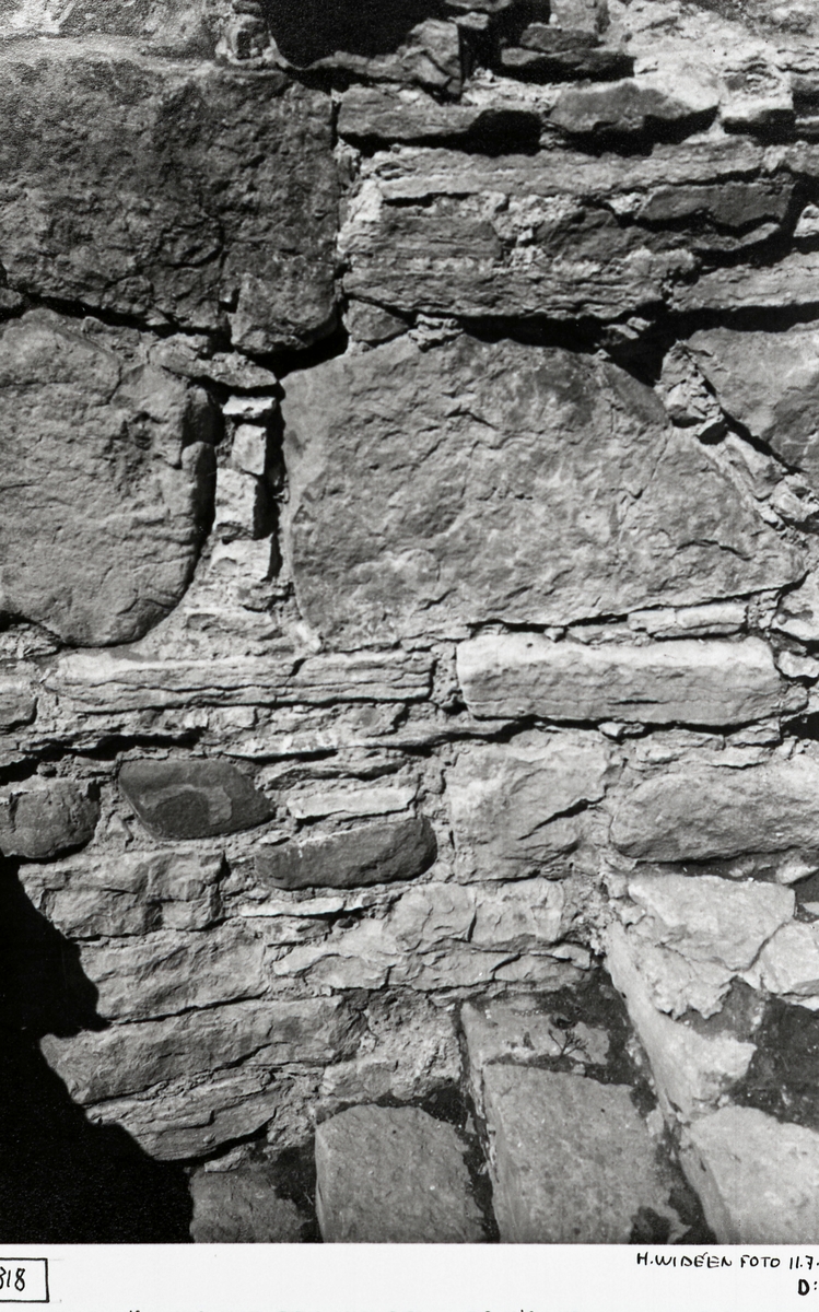 Östra huset. Norra väggens murverk vid den inre källartrappan från söder.