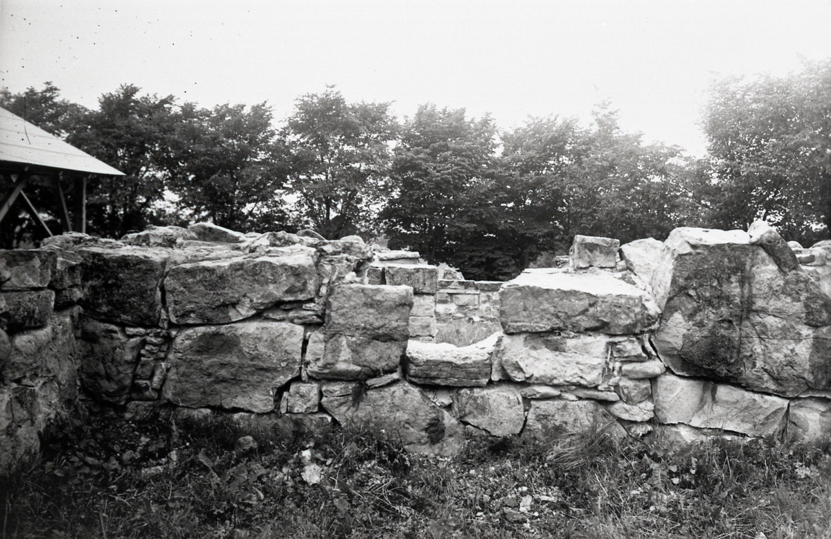 Norra korsgångens sydmur. Utsidan från södra partiet kring fönstret ovanför brunnen före framgrävningen av bottenskiktet.
