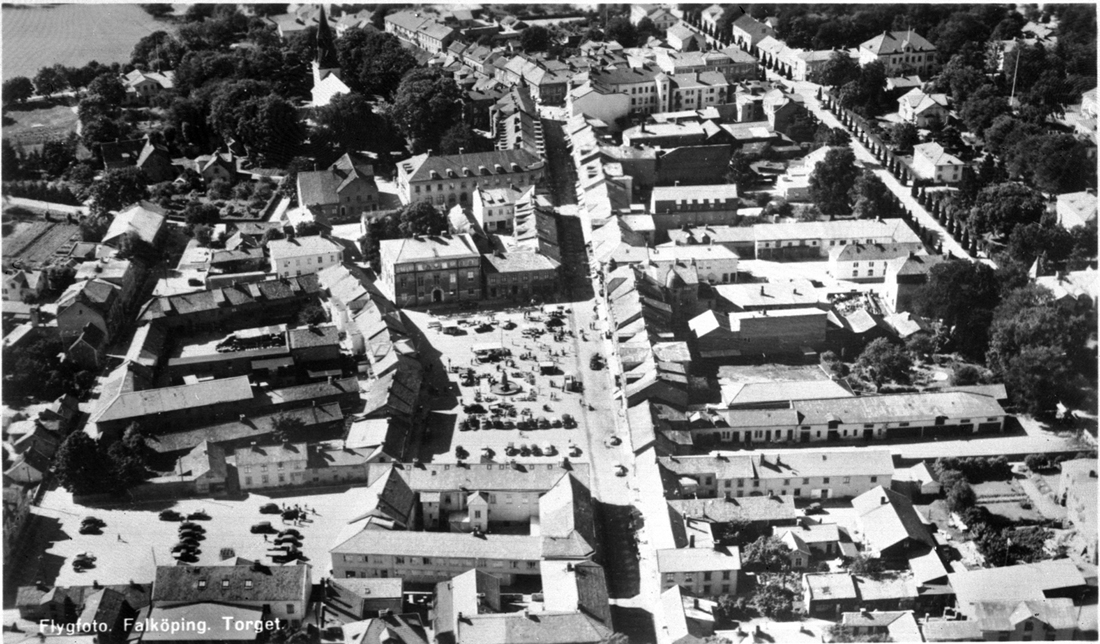 Flygbild över Falköping med torget i mitten.