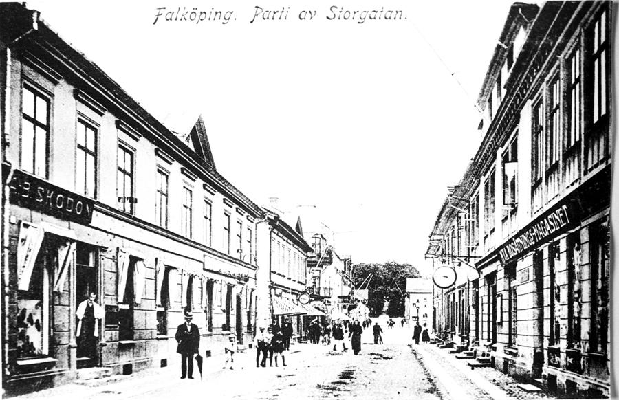 Storgatan. AB Skodon till vänster, Nya Bosättningsaffären till höger. Fotot taget innan Sparbanken byggdes 1928.