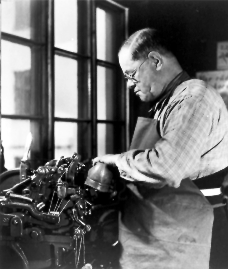 "Skomakare Robert Carlsson halvsular efter den nya metoden". Från utställningen "Falköping i bild" 1952.