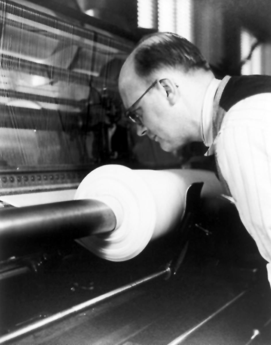 "Vävare vid kettelstol" (Svaréns). Från utställningen "Falköping i bild" 1952.