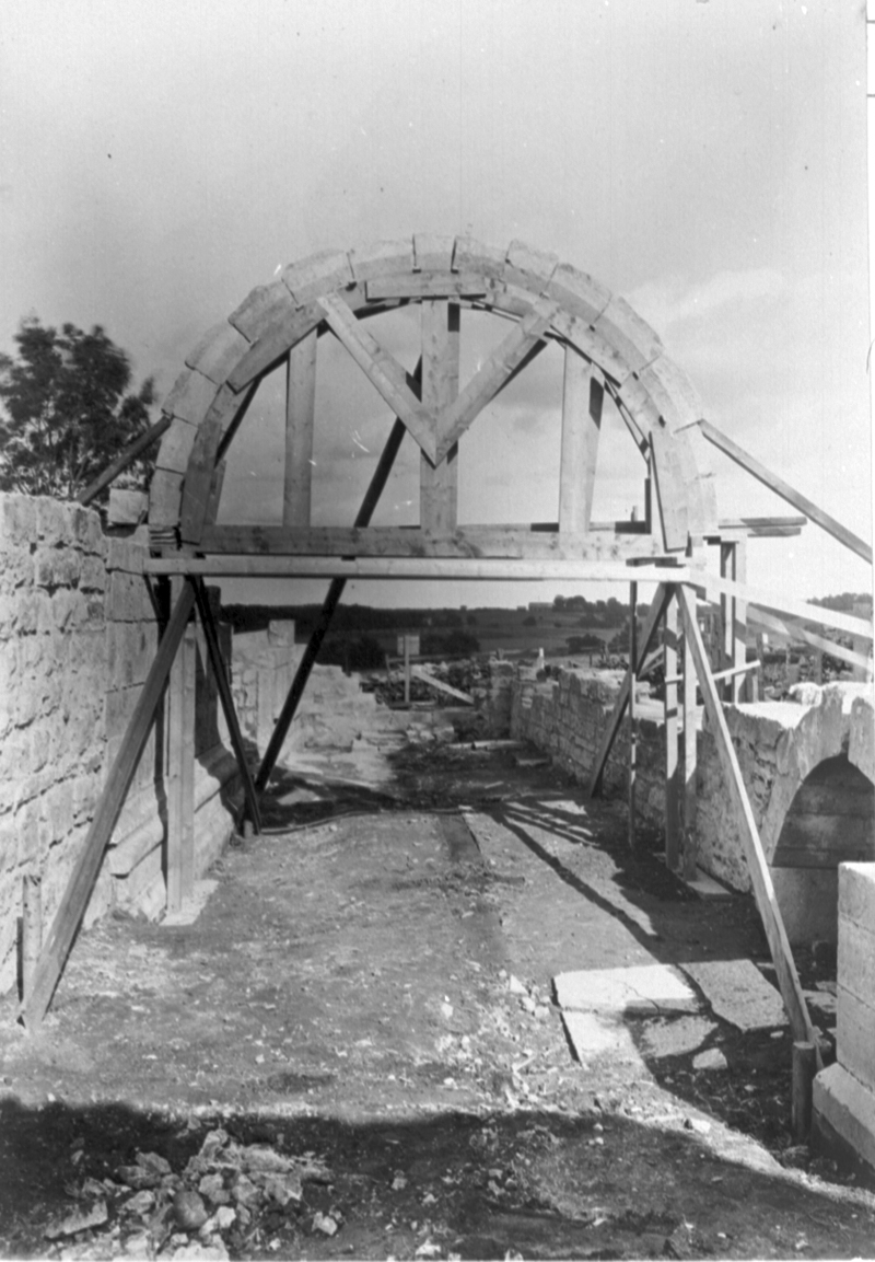 Bågar (sydkoret). Anträffad gördelbåge uppmurad på plats. Foto mot ö.