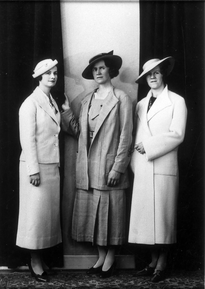 Dräkter med hemslöjdstyger. Den mellersta dräkten är i bomull, hel klänning med jacka, färgen gul. De två övriga är i vitt ylle.