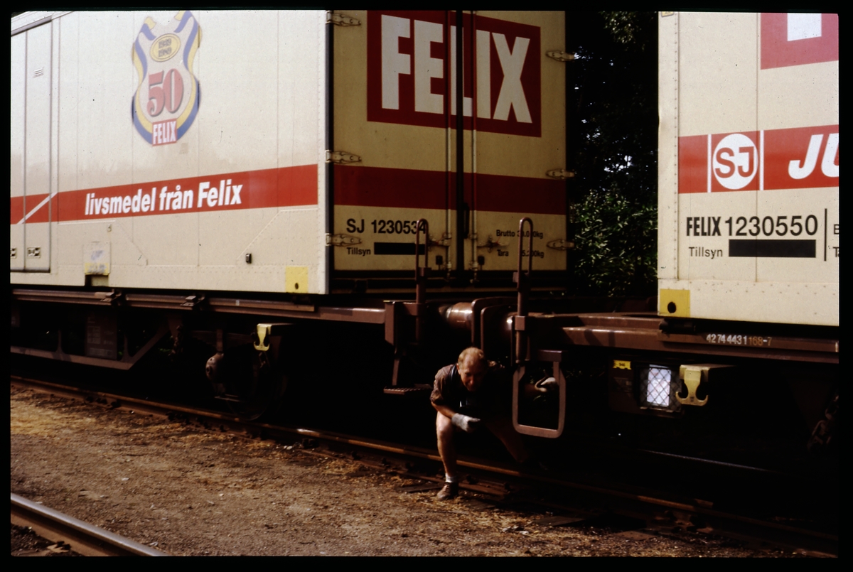 Statens Järnvägar, SJ Lgjns-w 42-74-443 1 168-7 med SJ jumbocontainer.