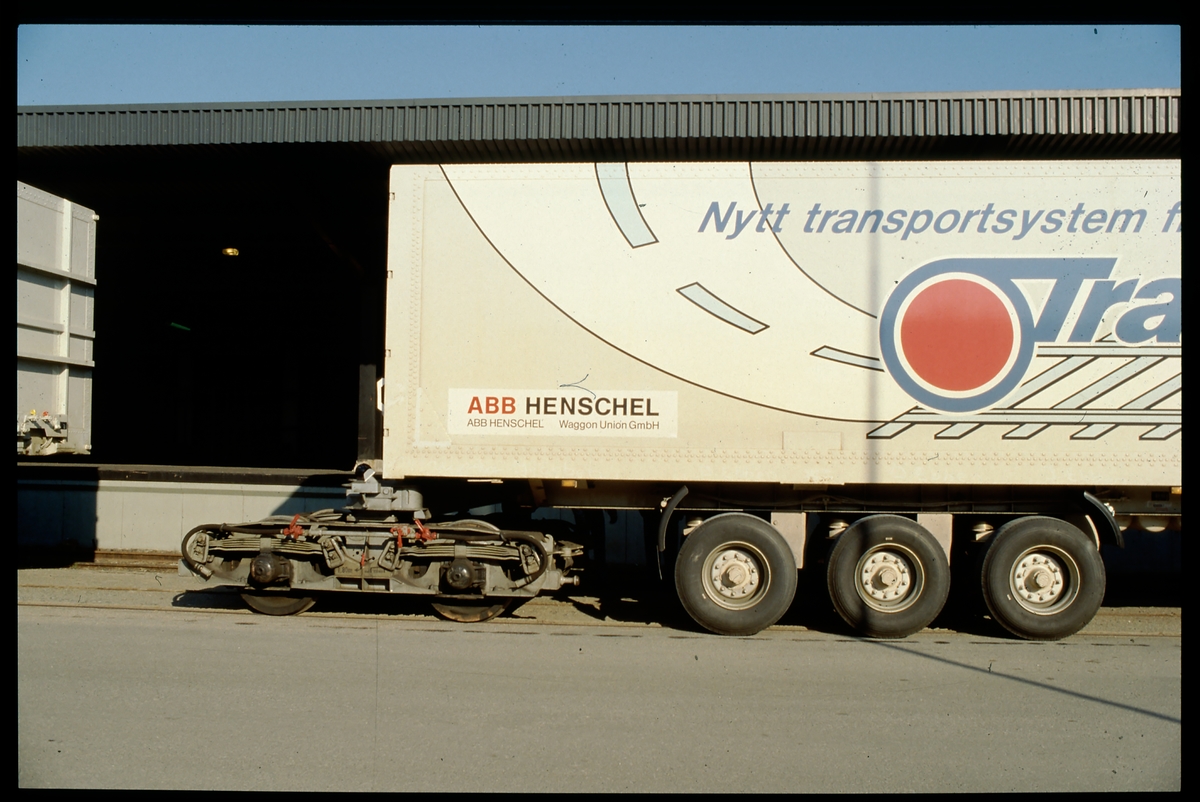 Lastbilssläp med Statens Järnvägar SJ UAS mellanboggi till SJ Trailer-tåg.