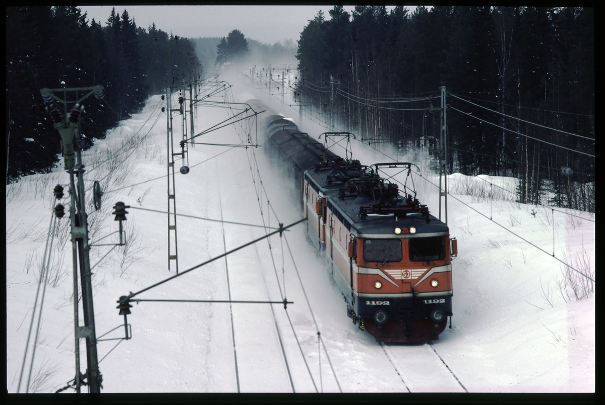 Statens Järnvägar SJ Rc4 1192 med godsvagnar.