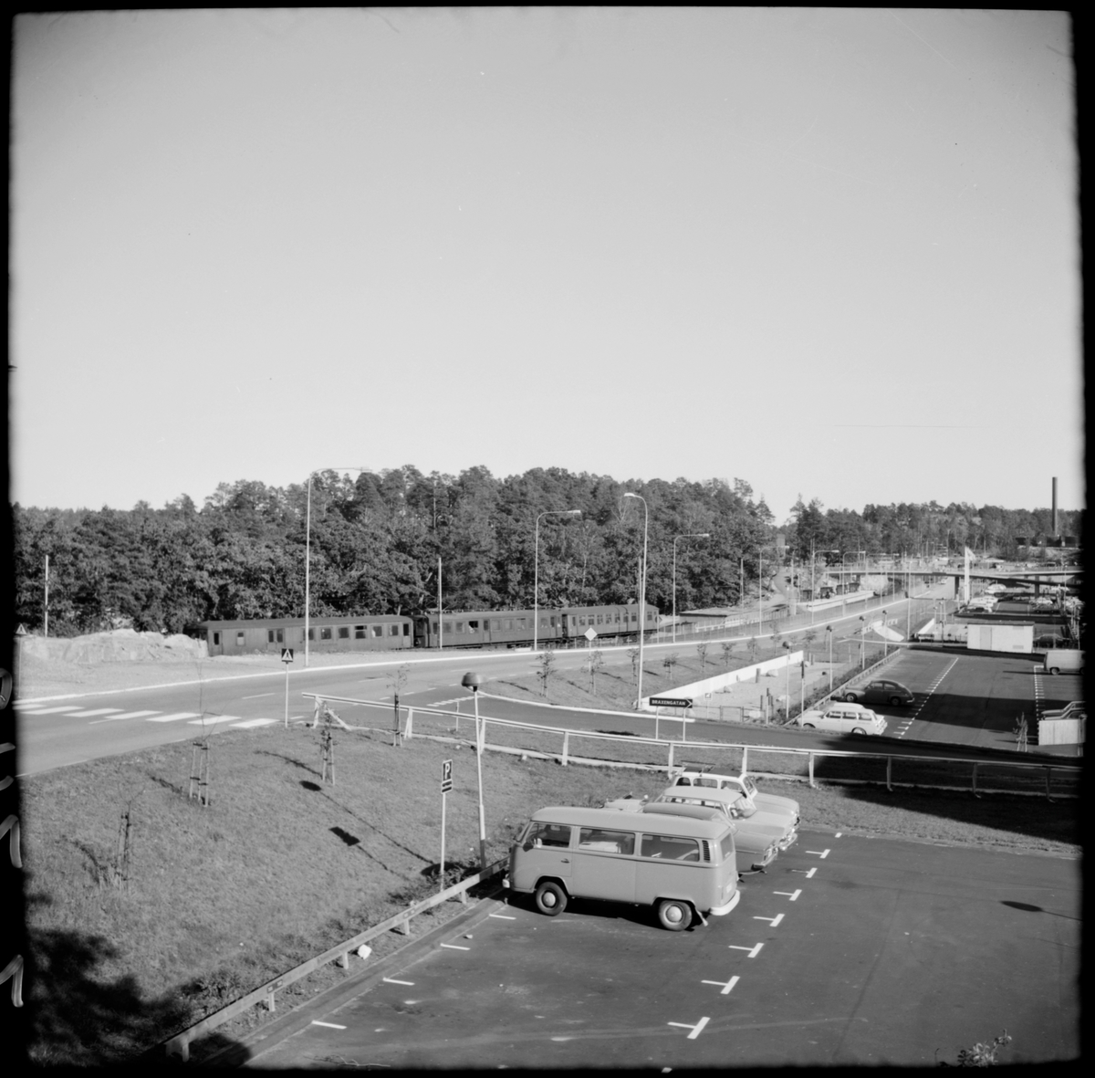 Persontåg på ingång till Fisksätra station, Saltsjöbanan sedd från Braxengatan.