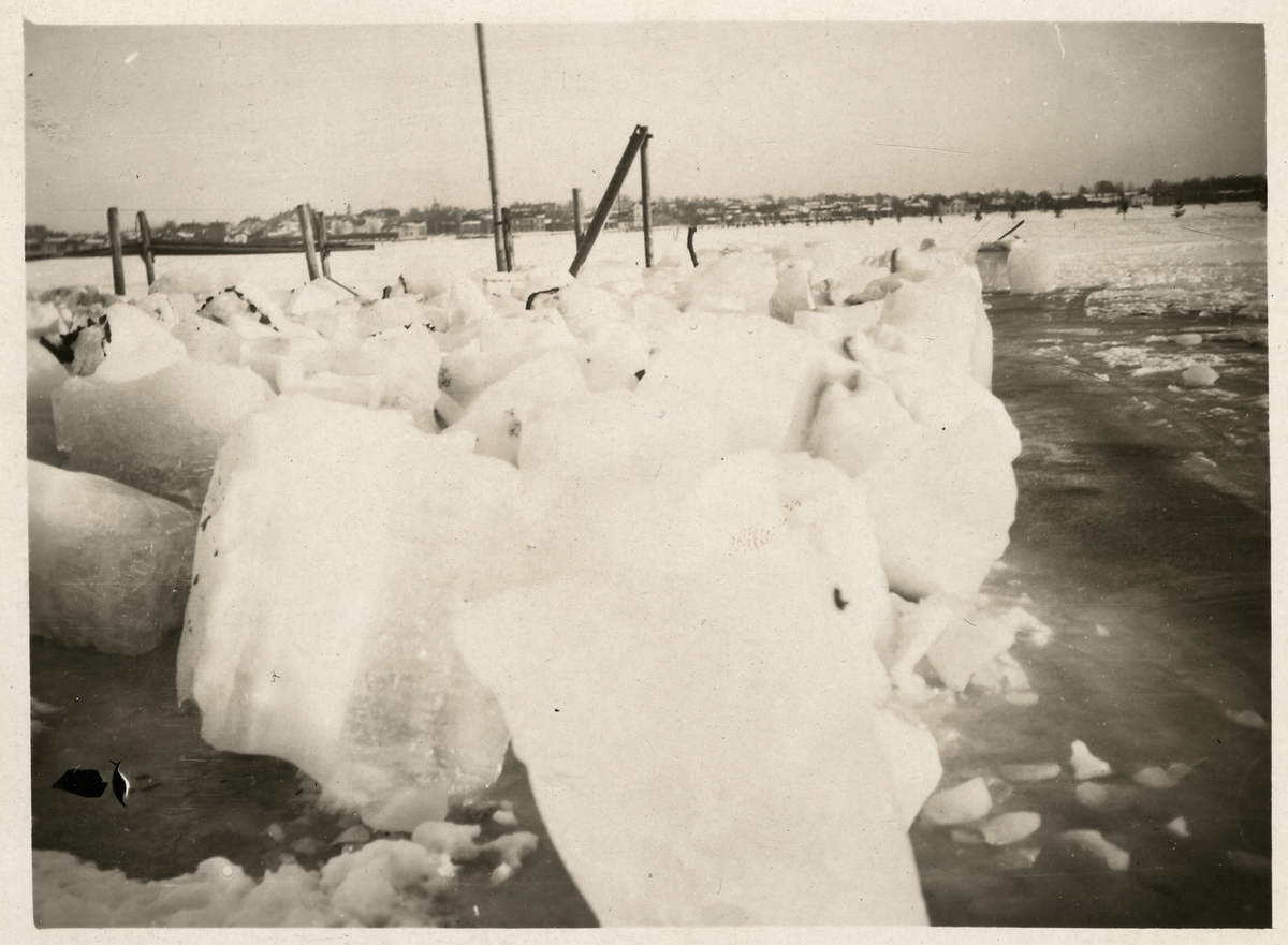 Upptagna isblocken vid vattenfåran efter isbrytningsarbete vid Statens Järnvägars slipersfabrik, Piteå.