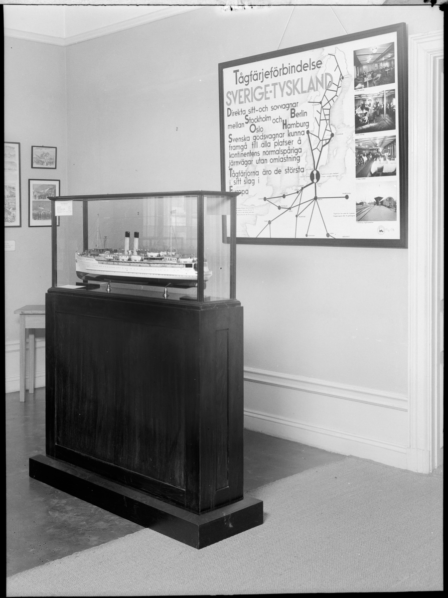 Titel: Foto av interiör med monter och tågfärjemodell.