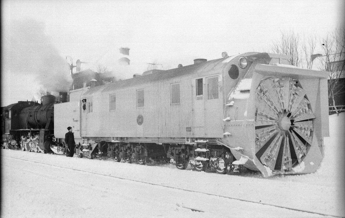 Bilden visar den nya snöslungan, SJ A5, avsedd för Skåne, samt ångloket som driver slungan.