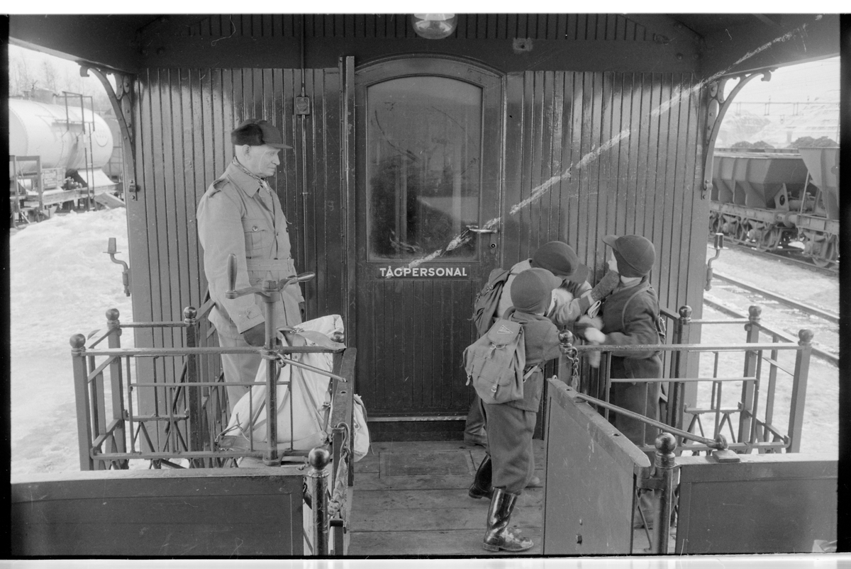 Lekande barn, som övervakas av en vuxen, på yttre plattformen på vagnen.