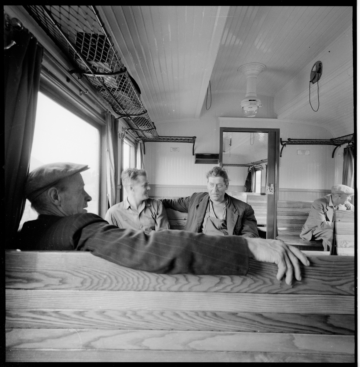 Titel: Tågresenärer i, Statens Järnvägar, SJ godsvagn, 3:e klass.