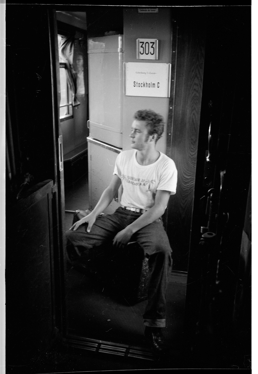 Ung man som tar en rökpaus i vagnskorridoren, någonstans på linjen mellan Göteborg C - Laxå - Stockholm C.