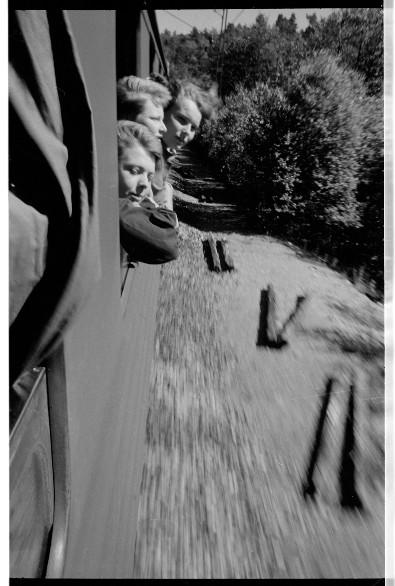 Titel: Linjebild med tågresenärer som lutar sig ut genom fönstren.
