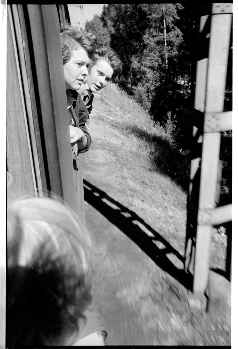 Titel: Linjebild med tågresenärer som lutar sig ut genom fönstren.