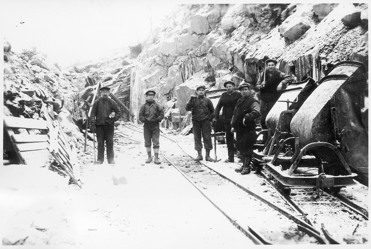 Rallare vid ortintag i skärningen 27/500. Decauvillespår, de färdiga rälslängder användes som provisoriska banor för banarbetsfordon.
