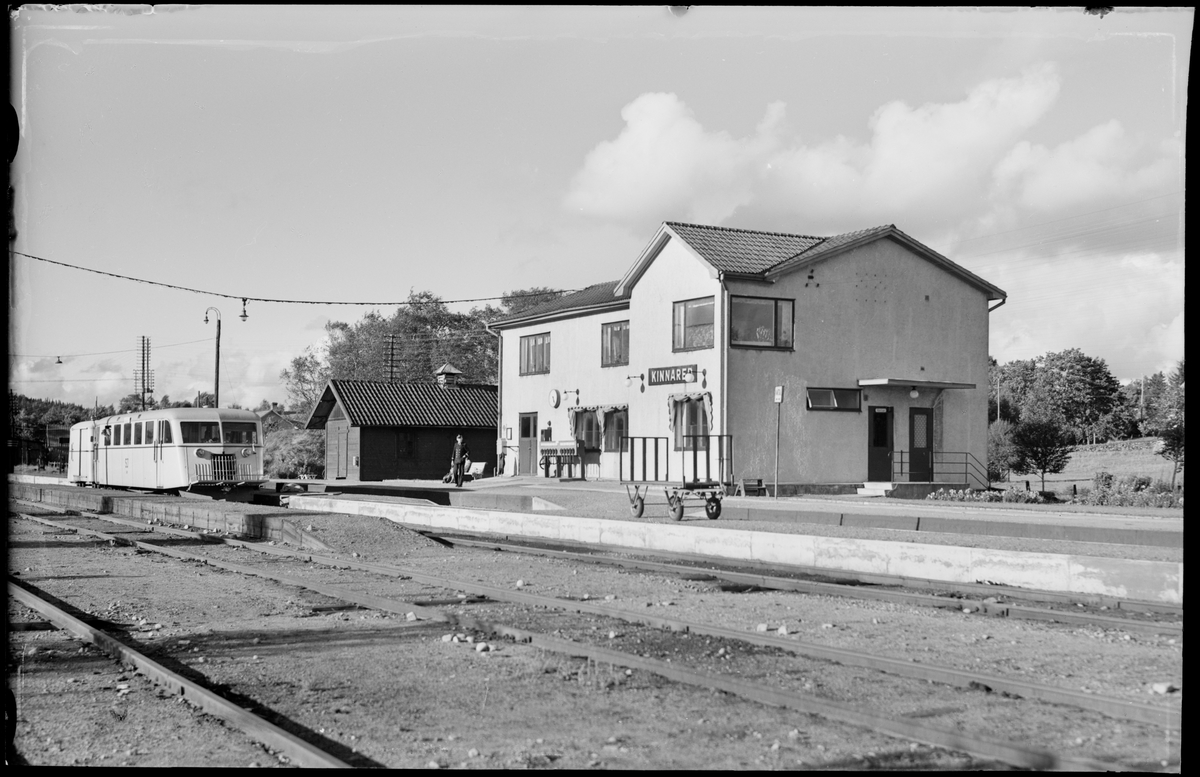 Kinnared station. Statens Järnvägar, SJ motorvagn med släp på spåret.