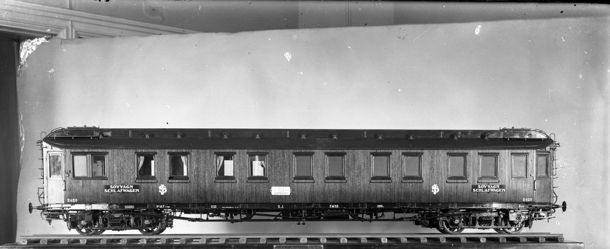 1:10 modell av Statens Järnvägars personvagn, SJ Ao2b 2420. Fotad vid Järnvägsmuseet, Stockholm.
