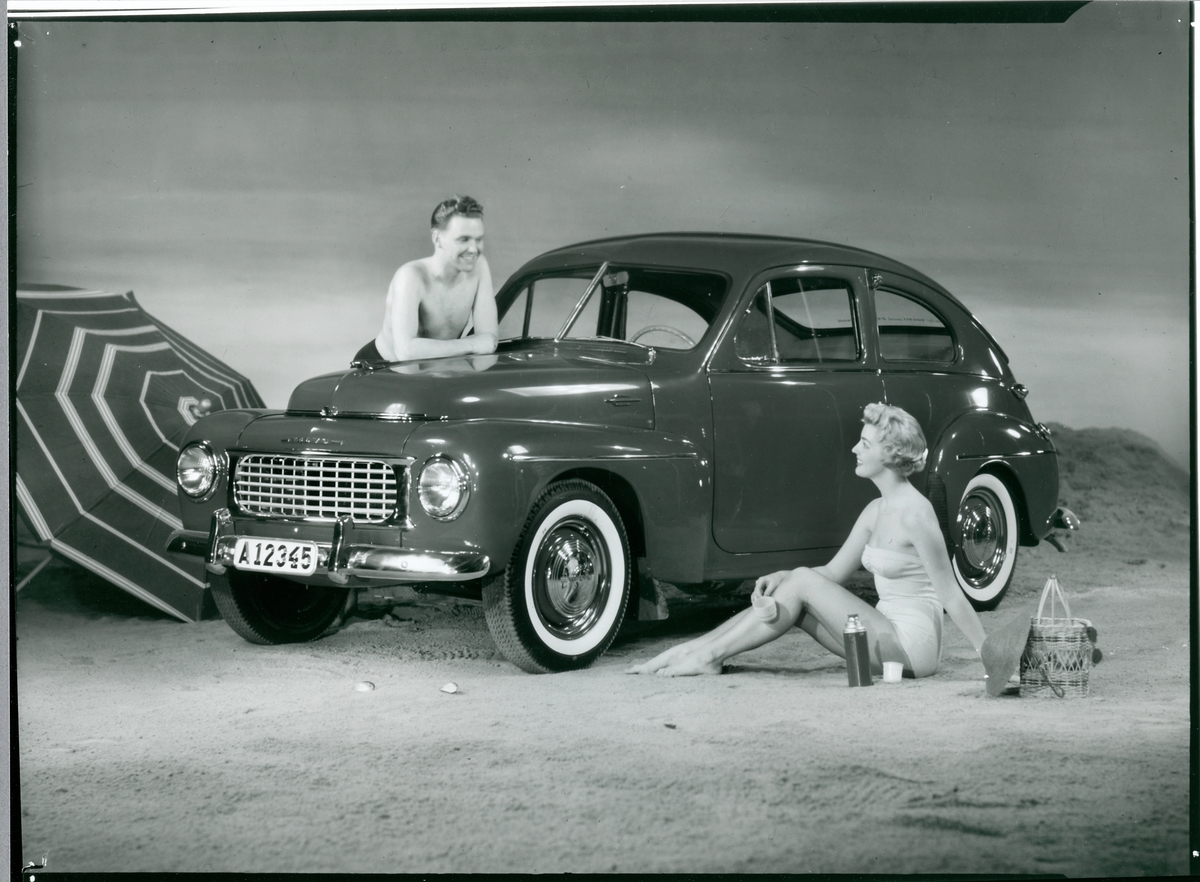 Reklambild från järnvägsmuseiutställning. Volvo PV 444, registreringsnummer A12345.
