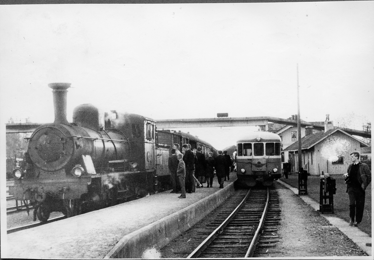 Rälsbusståg samt Statens Järnvägar, SJ Gp 3043 med vagnar i Åtvidaberg.