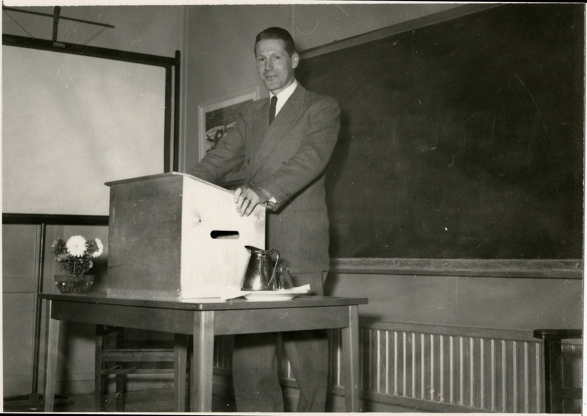 Titel: Man vid podium vid kurs i Jakobsberg.