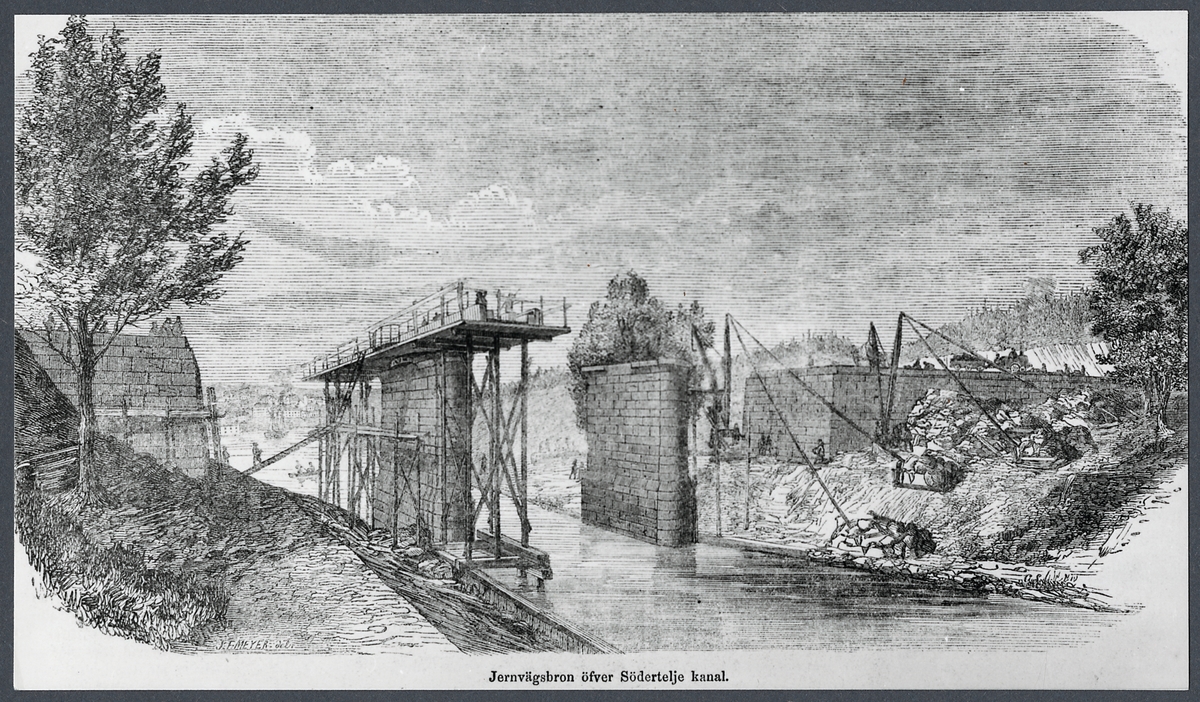 Teckning på uppbyggnad av järnvägsbro över Södertälje kanal år 1860.