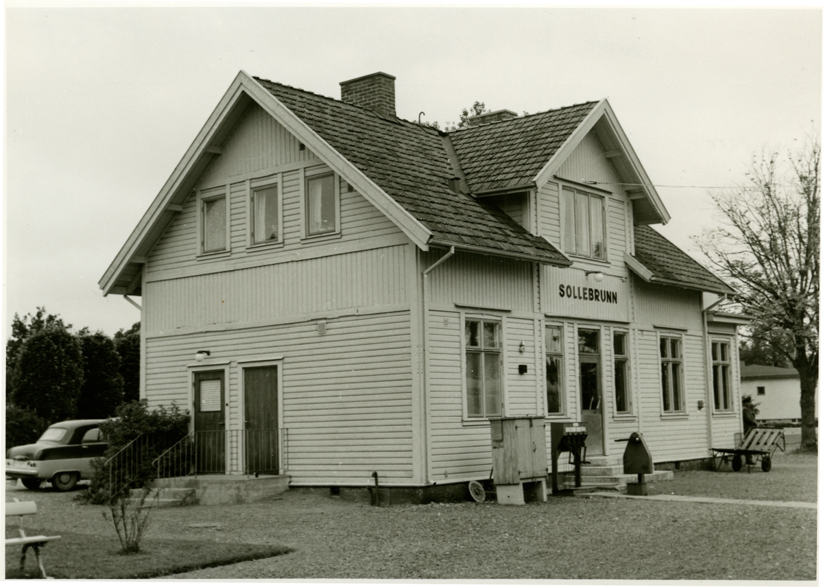 Sollebrunn station. Statens Järnvägar, SJ. Var mellan 1900-1970 station på Västgötabanan. Köptes av Statens Järnvägar, SJ 1948. Banan nedlagd 24/8 1970.