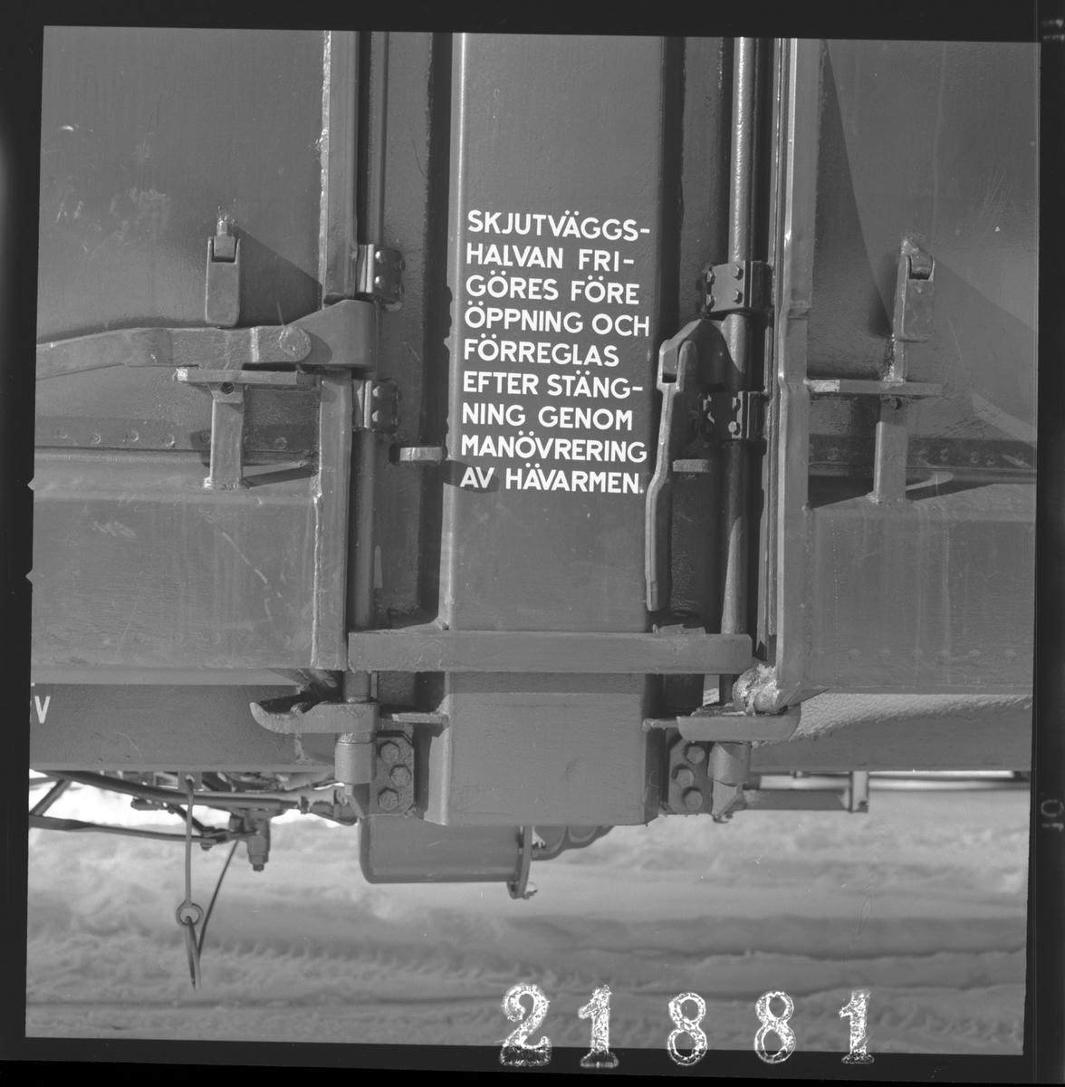 Statens Järnvägar, SJ Te 38637. Text på godsvagnen SJ Te 38637. SKJUTVÄGGSHALVAN FRIGÖRES FÖRE ÖPPNING OCH FÖRREGLAS EFTER STÄNGNING GENOM MANÖVRERING AV HÄVARMEN.