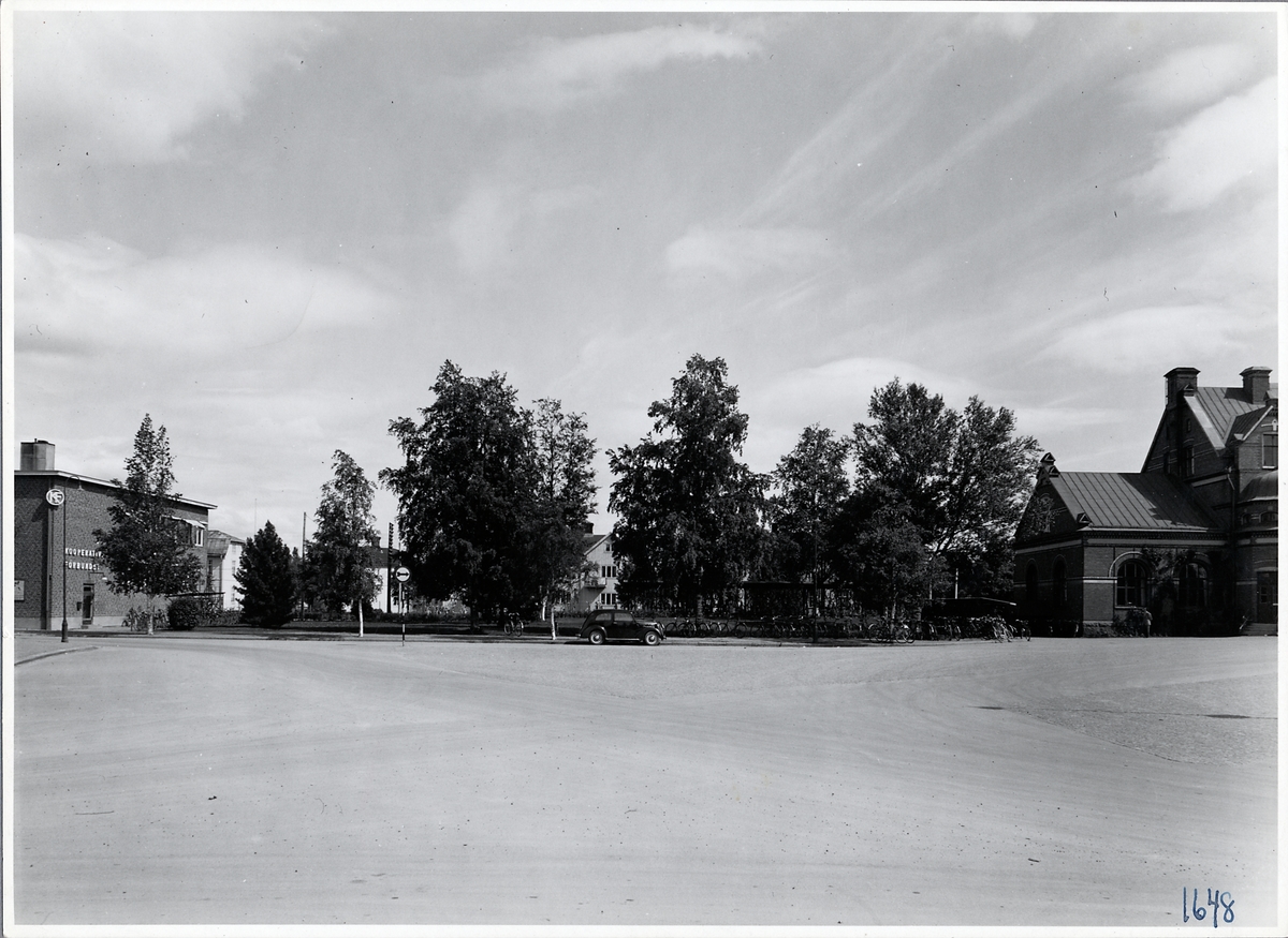 Stadsbild med Kooperativa Förbundet, KF, till vänster och stationen till höger.