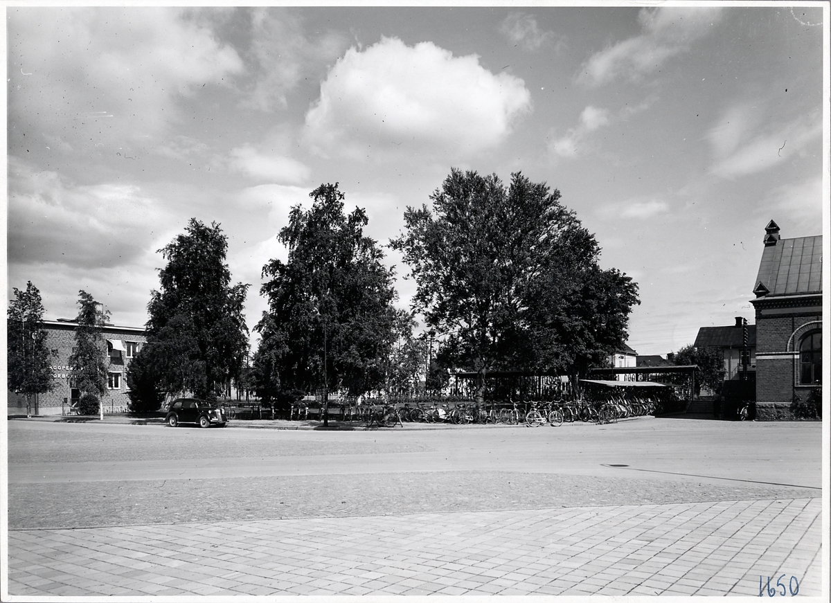 Stadsbild med Kooperativa Förbundet, KF, till vänster och stationen till höger.