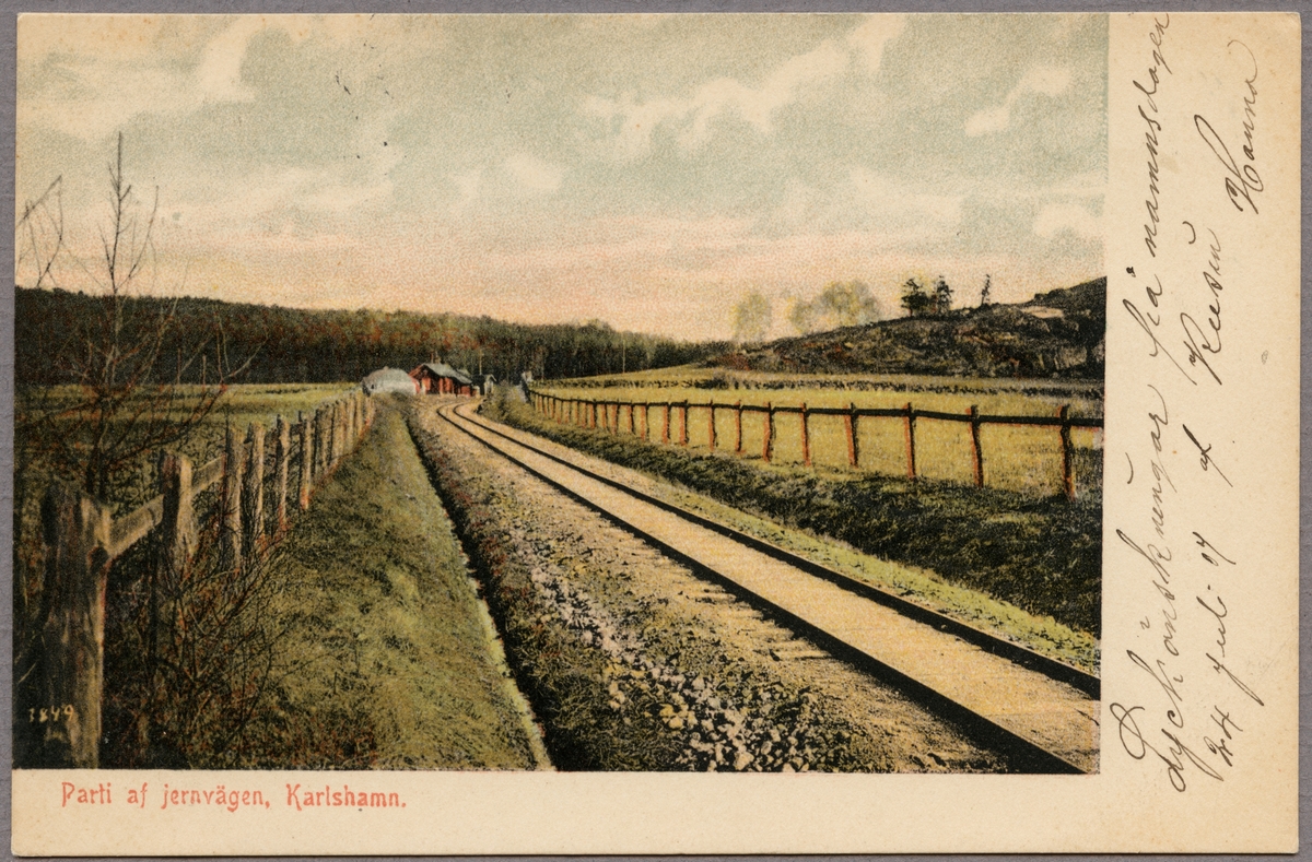 Vy på järnvägslinje med byggnader i bakgrunden.