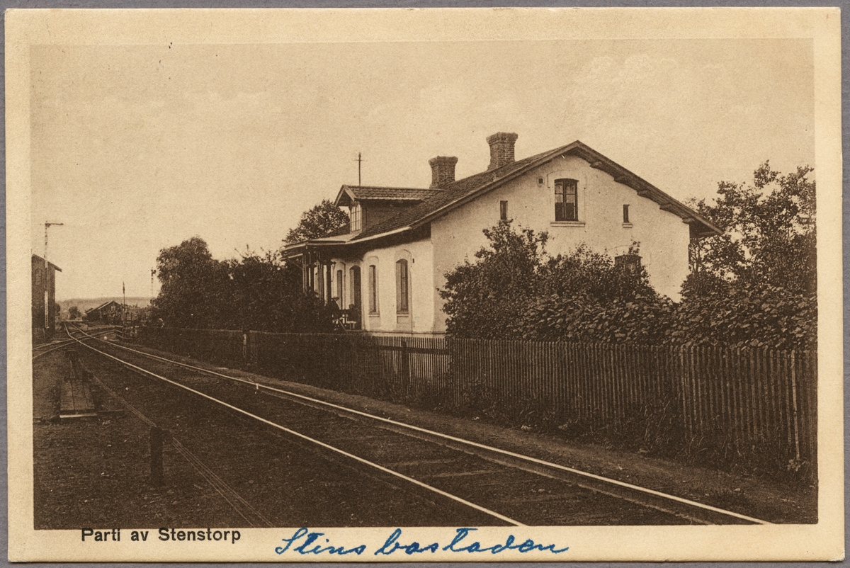 Vy på järnvägslinje mot bangård och stinsbostad i Stenstorp.