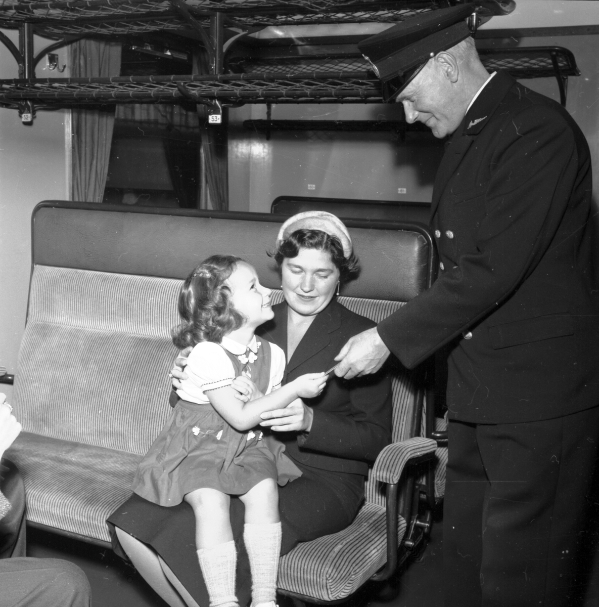 Titel: Flicka med mamma på tåget visar barnbiljett.