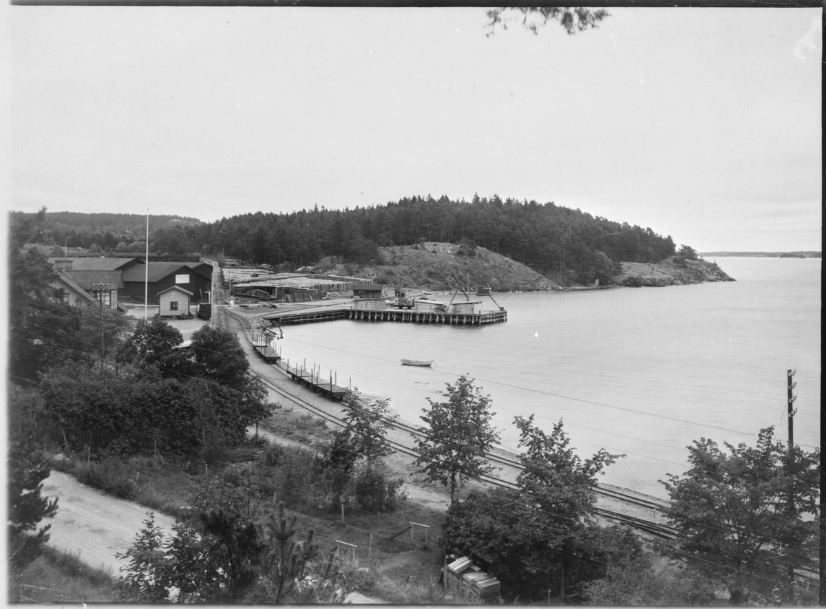 Järnvägsstationen i Kolmården, till vänster i bild och Sandvikens kaj mitt i bild.