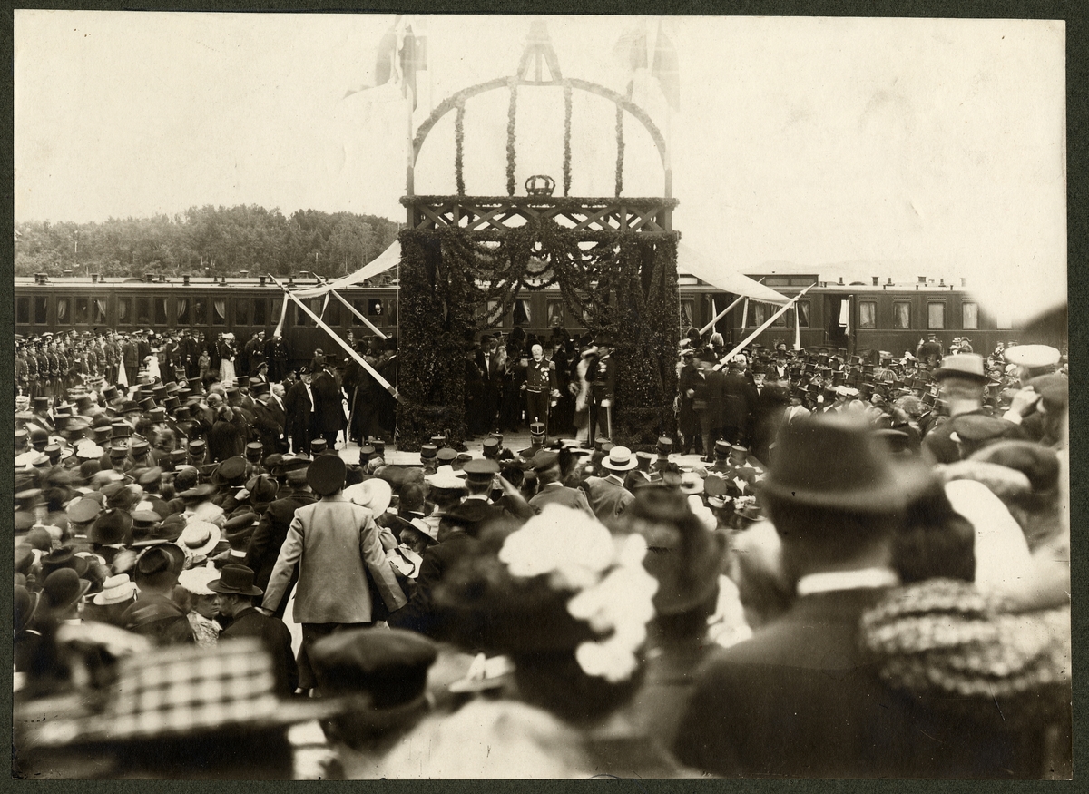 Konung Oskar II i amiralsuniform vid järnvägsinvigningen i Narvik 1903. Norske Statsbaner