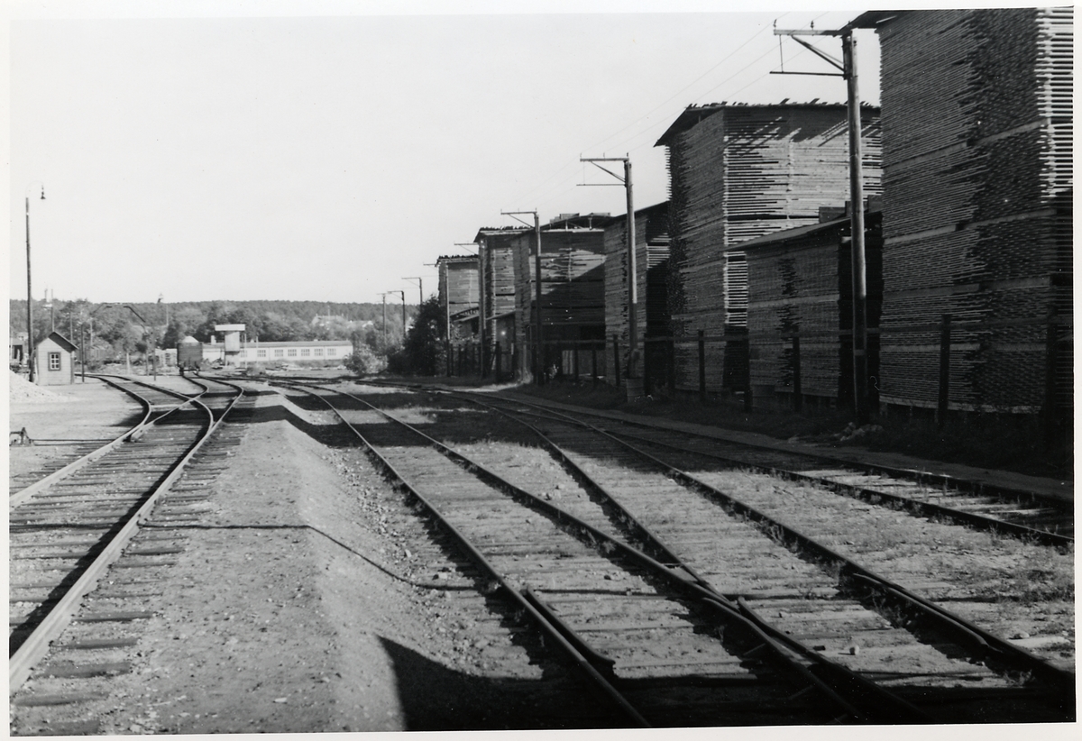 Bangårdsområde i Hudiksvall. Håstaholmens sågverks brädgård. Rakt fram syns bussgaraget och ett luftbevakningstorn.