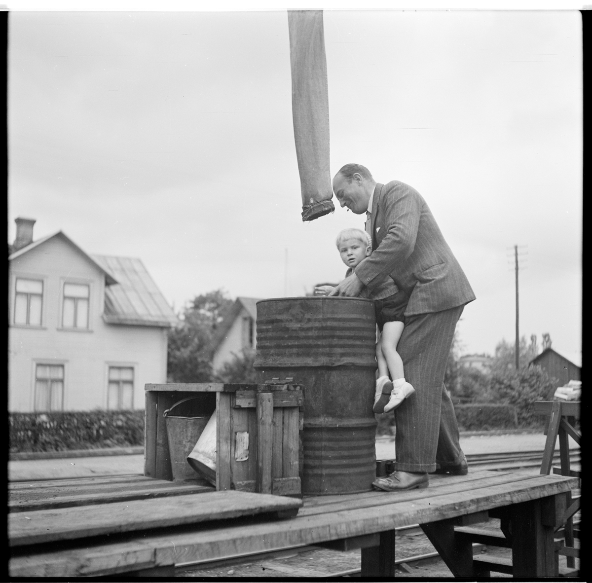 Man hjälper barn tvätta händerna i vattentunnan under vattenhästen.