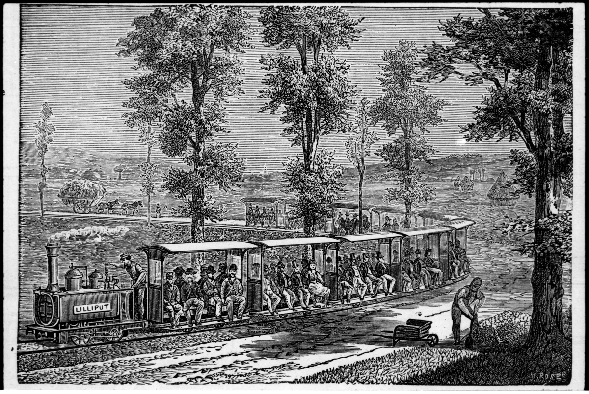 Titel: På landsbyggden ses ett ånglok med tio stycken öppna personvagnar. Samt ett hölass draget av två hästar.