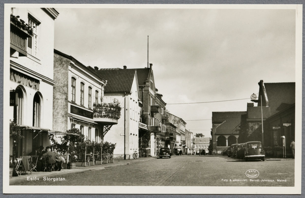 Vy över Storgatan i Eslöv med stationshuset till höger.
